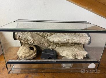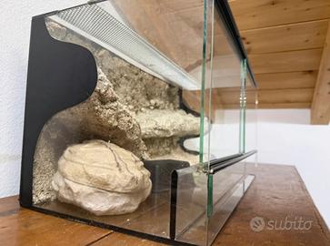 In vendita terrario in vetro di buona qualità, ideale per rettili e anfibi di piccola taglia. Dimensioni: 60 cm (lunghezza) × 30 cm (larghezza) × 30 cm (altezza) Perfetto per: • Gechi leopardo, crested gecko • Camaleonti nani • Rane, rospi o altri anfibi • Insetti o aracnidi Dotazione inclusa: • Grande roccia di sfondo in resina • Grotta/tana in resina • Casetta nera in plastica con ingresso • Ciotola per acqua trasparente • Rete superiore per buona aerazione e fissaggio lampade Il terrario è in ottime condizioni: vetro pulito, struttura solida e guarnizioni in buono stato. Pronto all’uso, basta aggiungere il substrato e l’illuminazione/riscaldamento adatti alla specie. Setup completo e funzionale a un ottimo prezzo!