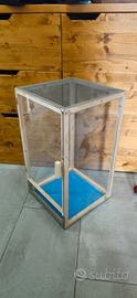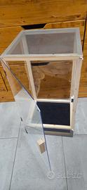 Teca nuova, base circa 33x33cm, altezza 60cm. Struttura in legno resistente all'umidità, fondo in materiale plastico rigido impermeabile. Colore del fondo variabile in base alla disponibilità (grigio, nero, blu, verde). Pareti laterali e posteriore in laminato plastico trasparente (foglio PET). Sportello 33x50cm in Plexiglass con chiusura magnetica e gancetti di sicurezza. Top e striscia frontale bassa in zanzariera in fibra plastica colore grigio. Ideale per allevare insetti stecco, insetti foglia ed altri artropodi o piccoli rettili arboricoli.