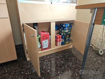 Vasca nel fondo in acciaio inox e mobile portaoggetti nella parte inferiore.