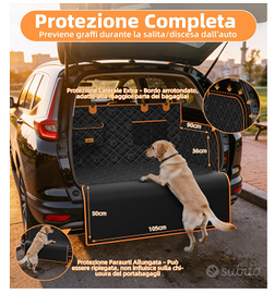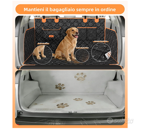 Telo Bagagliaio Auto per Cani 198x105 cm – Impermeabile 5 Strati con Protezione Laterale e ParaurtiTelo Bagagliaio Auto per Cani 198x105 cm – Impermeabile 5 Strati con Protezione Laterale e Paraurti. Vendo telo copri bagagliaio per cani marca UPAWPIA, universale e super resistente, ideale per proteggere l’auto da peli, fango, graffi e liquidi. NUOVO 🚗 Dimensioni: 198 x 105 x 36 cm Vestibilità universale per SUV, berline, station wagon, crossover, minivan, pick-up e fuoristrada. 🛡 Protezione a 5 strati – Impermeabile e Anti-graffio Realizzato con: Tessuto Oxford 600D resistente ai graffi Rivestimento TPU impermeabile Imbottitura in ovatta PP 100g Poliestere 210D morbido e resistente Base con retro in silicone antiscivolo Protegge il bagagliaio da zampe fangose, liquidi, peli, sporco e polvere, mantenendolo pulito e asciutto. 🔒 Design antiscivolo e sicuro Base in silicone antiscivolo Cinghie regolabili e fibbie a sgancio rapido Velcro resistente per fissare i lati Rimane stabile anche durante la guida su strade dissestate. 📦 Protezione completa 360° Lembi laterali con cerniere (90x36 cm) Paraurti pieghevole (105x50 cm) per evitare graffi durante salita/discesa del cane 3 tasche porta accessori (guinzaglio, giochi, snack, ecc.) 2 cerniere anti-dispersione peli 🧼 Facile da installare e pulire Montaggio rapido con velcro e cinghie regolabili. Lavabile: basta un panno umido, aspirapolvere o anche lavaggio con acqua / in lavatrice. 🎒 Multifunzionale Perfetto non solo per animali, ma anche per trasportare spesa, bagagli, attrezzatura sportiva o da campeggio. Utilizzabile anche come telo da picnic. Condizioni: NUOVO Spedizione veloce