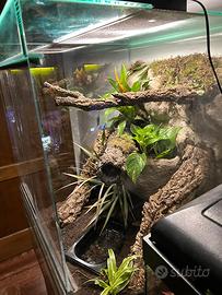 Interno curato con sfondo, rami, piante e substrato, pronto per ospitare rettili o anfibi.