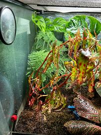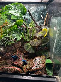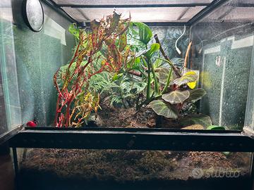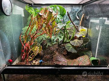 Allestimento naturale con piante vive che garantiscono un’ottima umidità, numerosi rifugi e un micro-ecosistema stabile.