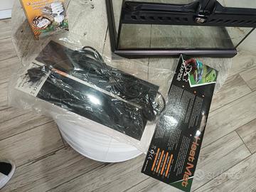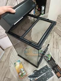 vendo terrarrio exoterra in perfette condizioni misure 30x30 per 45 di altezza doppia anta e chiusura di sicurezza sfondo 3d comprato a parte e porta lampada sempre preso a parte completo di lampada uvb nuova e tappetino 7watt nuovo