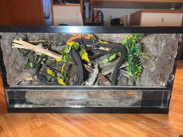 Vendo terrario adatto a geco leopardino di misure 70x33x38cm. Il terrario viene venduto come vedete in foto con sfondo con schiuma espansa, terrazzamenti per nascondigli e arrampicarsi, legni e substrato (25% reptile sand, 25%fibra di cocco, 40% repti soil, 10% excavator clay). Il tutto é stato fatto da me AMATORIALMENTE. Non sono un professionista ma volevo provare. Il prezzo che vedete é fisso perché solo di materiali ho spese più di quella cifra