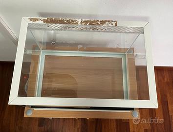 Vendo terrario in vetro, ideale per piccoli rettili, anfibi, gasteropodi, insetti o come teca espositiva. Struttura solida con cornice bianca. Presente una piccola crepa sul lato posteriore destro (visibile in foto), che non compromette assolutamente la stabilità o l’utilizzo. prezzo non trattabile, ritiro di persona.