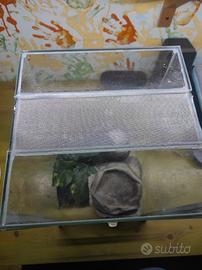 Vendo terrario in vetro sviluppato in altezza, artigianale, cedo assieme alla teca anche una pianta finta,una tana, e due ciotole, è ottimo per ospitare insetti stecco, fasmidi, migali arboree,ecc,ecc.