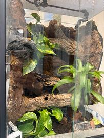 Terrario bioattivo per geco arboricolo. Substrato con terricico, foglie e 2 colonie di Collemboli. Piante vive. Tronchi cavi. Per accessori (nebulizzatore automatico, illumimazione, ciotoline e cibo) 75€ aggiuntivi.