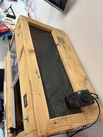 Vendo terrario in legno con parete rocciosa sul fondo, prese d’aria ai lati e al di sopra. Annnesso tappetino riscaldante e calcolatore dell’umidità. Impossibilità a spedire, solo ritiro fisico.