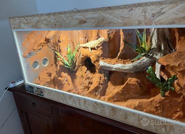 Fantastico terrario realizzato a mano apposta per pogone cercando di riprodurre il piu possibile il loro ambiente naturale. Purtroppo è rimasta solo la pianta di destra e le altre due le ho dovute togliere perche la mia pogona le mordeva. Misure: H 60,5cm L 115cm Profondità 60,5cm