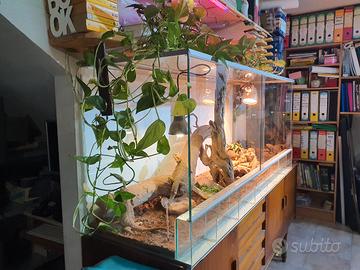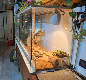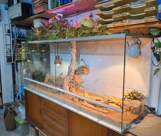 Vendo bellissima teca rettilario di grandi dimensioni Misure : 160 lunghezza , 72 altezza , 52 profondità , perfetta per tutti i tipi di rettili , pogone, gechi , serpenti , iguana e qualsiasi altro , il rettilario è completo di fondo argilloso naturale , 2 tappeti sotto roccia riscaldanti , 1 lampada UVA e 2 lampade Solari da 70 w Solar HID A spot , 1 tronco inclinato e 1 tronco verticale + le pietre e le rocce sono in regalo . , il rettilario è costruito in vetro temperato chiaro da 6mm antiriflesso e a bassa dispersione di calore e rinforzato con profilo in alluminio , adatto anche come paludario in quanto stagno fino a 15 cm di altezza perfetto per creare ambienti per rane e anfibi . o ambienti per orchidee N.B. le foto dellallestimento sono dimostrative , nessun tipo di animale è incluso in questa vendita . prezzo trattabile in quanto vendo anche solo vetri marca " Blue earth "