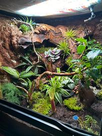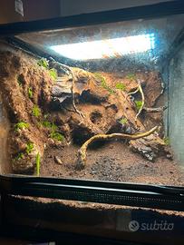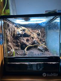 vendo terrario tropicale zoo med come nuovo, misure 45x45x45. viene ceduto privo di piante, all’interno rimarranno sfondo 3d creato con schiuma espansa e fibra di cocco, piu tutti i legni presenti in foto. substrato gia presente composto da lapillo vulcanico come drenante, doppio foglio di TNT, e un mix di terriccio, sabbia, fibra di cocco, foglie e muschio, il tutto gia colonizzato da collemboli. in piu cedo in dotazione tappetino ricaldante da 10watt. non vendo illuminazione, non vendo impianto d’irrigazione. per maggiori info e foto contattatemi.