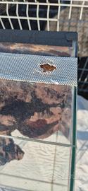 Vendo terrario 33x68x38cm con sfondo fatto a mano. presenta un buco sulla griglia d'areazione superiore e il vetro è scheggiato su uno degli angoli davanti (vedi foto)