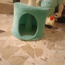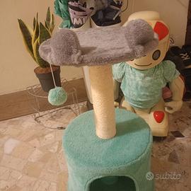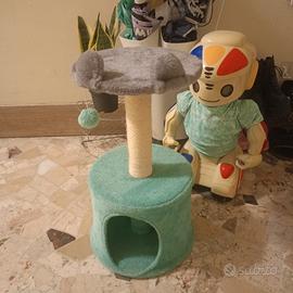 Tiragraffi per gatti con base e piattaforma rivestiti in morbido tessuto. Usato pochissimo, solo un paio di volte. È praticamente nuovo. - Colonne avvolte in corda di sisal per unghie. - Piattaforma superiore imbottita per riposo. - Base stabile per maggiore sicurezza. - Senza scatola originale