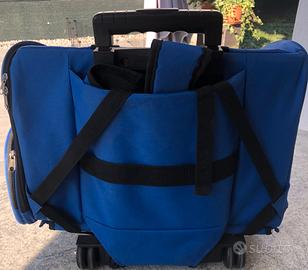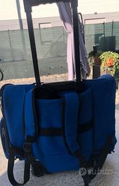 Trasportino da viaggio per animali 10/12 kg. con cinghia interna. Da usare sia come borsa-trolley oppure come zaino. Con 2 tasche laterali contieni oggetti e un vano dietro. mis.: 45x24x37