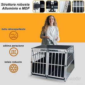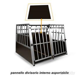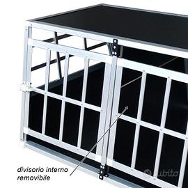 Trasportino per cani in alluminio a due porte e con pannello divisorio interno rimovibile adatto per trasportare in sicurezza e nel rispetto delle leggi uno o due cani di taglia media e grande, trova alloggiamento nel vano bagagliaio di auto, nei pick up, furgoni.
