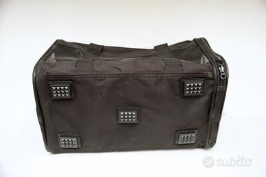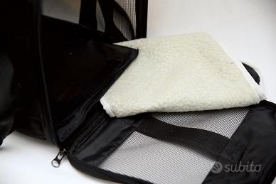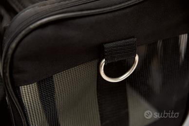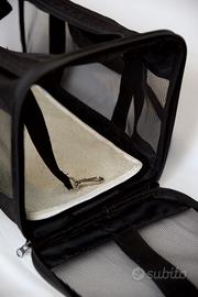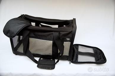 đž Trasportino Nero per Viaggio (40x25x25 cm) Pratico trasportino morbido in tessuto resistente, ideale per il trasporto di gatti o cani di piccola taglia. Perfetto per viaggi in auto, treno e, grazie alle sue dimensioni, accettato come bagaglio a mano in cabina da diverse compagnie aeree. Caratteristiche Principali: ⢠Colore: Nero. ⢠Dimensioni: 40 cm (Lunghezza) x 25 cm (Larghezza) x 25 cm (Altezza). ⢠Ventilazione: Ampi inserti in rete traspirante su tre lati (fronte, retro e superiore). ⢠Aperture: Accesso facile sia dal lato anteriore che da quello superiore. ⢠Interno: Fondo rimovibile e lavabile con un lato morbido e chiaro per il comfort (vedi foto). ⢠Sicurezza: Gancio di sicurezza interno per il collare. â Condizioni Il trasportino è in ottime condizioni generali, usato con cura e pulito. Non presenta strappi o difetti strutturali.