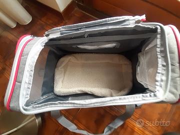 grigio in nylon tipo rete su tutti i lati fondo imbottito biancofinto pelo e nylon completo di tracolla e tasche laterali-lungh. 44x 27x 30cm altezza come nuovo, pieghevole