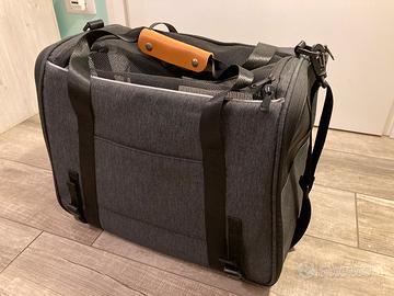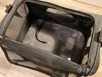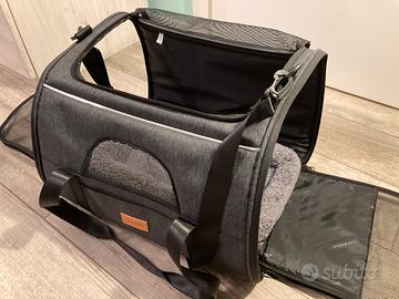 Vendo trasportino per cani o gatti, misure 43x30cm, altezza 35cm. Completo di cuscino morbido staccabile, lavabile, tasche laterali per salviettine e guinzagli. Ideale per cani taglia medio piccola (max 9/10kg). Usato 1 volta per andare a prendere un cucciolo che ormai non ci sta più 😄, praticamente nuovo di zecca!