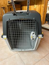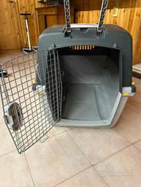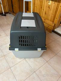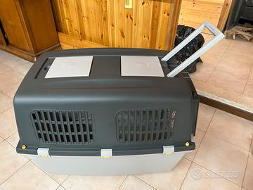 Vendo trasportino Gulliver Trixie, comprato su Zooplus ed usato pichissimo.Trasporto in auto, treno e aereo.Omologato IATA.Dotato di maniglia per trasporto, consigliate rotelle.Misure esterne L 92xP64xH64 cm; peso box vuoto 8.9 kg; peso max cane 38 kg. Comprato troppo grande per i miei due Main Coon.