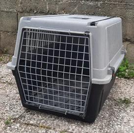 Pratica gabbia per il trasporto di cani. - Realizzata in plastica resistente e griglia in metallo verniciato. - Design a ventilazione. - Chiusure laterali di sicurezza. Colore Nero e Grigio Misure Larghezza 50 cm Altezza 52 cm Profondità 68 cm