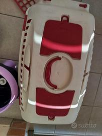 presente trasportino con griglia colore rosso e bianco con sportellini superiori apribili (vicino alla maniglia).