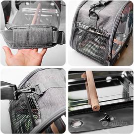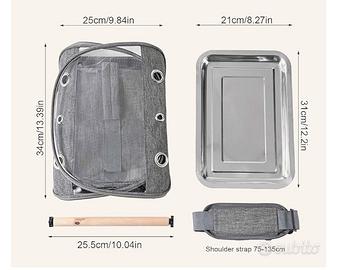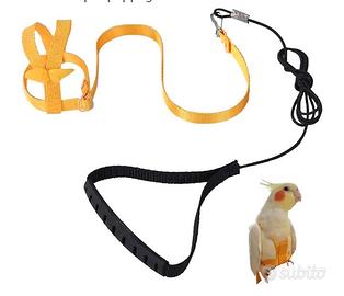 Trasportino con asta di legno e vassoio in acciaio inox, portatile, con tracolla regolabile per piccoli pappagalli, perfetta per calopsite, e piccoli animali, colore grigio. Pettorina di colore giallo. Mai usati. Solo ritiro a mano. Non spedisco