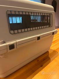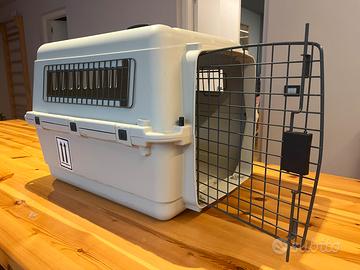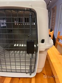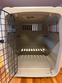 Trasportino KENNEL per cani e gatti di taglia M : L69 W51 H48. Omologato IATA per il trasporto in aereo. In materiale plastico resistente alle temperature elevate e agli urti con sistema di chiusura su 3 lati per protegge l´animale dai rumori e dalle fonti esterne di disturbo. Lato superiore amovibile e utilizzabile in questo modo anche come cuccia.