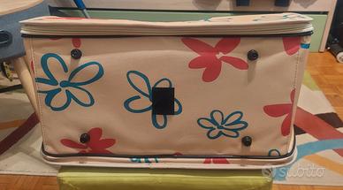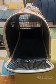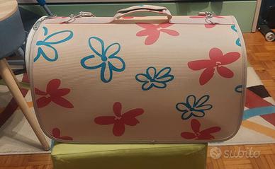 Vendo trasportino per cane o gatto in tessuto esterno e plastificato all'interno, con maniglia, tracolla, si apre su un lato come entrata e in più con un altra zip si può aprire tutto per poterlo pulire, sotto ha 4 piedini e un piccolo velcro, lungo 50 cm, largo 20 cm e alto 29 cm. Di colore beige con dei fiori colorati. Nuovo mai usato per taglia sbagliata. Più eventuale spedizione.