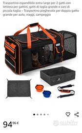 trasportino nuovo, usato una sola volta. ideale per 2 gatti oppure un cane di taglia media. contiene ciotole da viaggio e vaschetta per lettiera