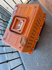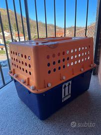 Trasportino omologato per voli internazionali, in plastica rigida con sportello a gliglia metallica e chiusura a molla, utilizzato una volta sola.