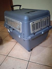 4 trasportini usati una sola volta, omologati per aereo 70 cm lunghezza x 53 cm larghezza, 50 cm altezza + ruote estraibili, mangiatoie e beverini. Fino a 30 kg. Prezzo per singolo pezzo.