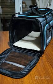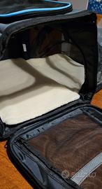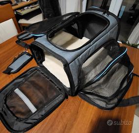 Trasportino per animali domestici fino a 8kg. Aperture laterali e sopra, la base rivestito con pellicciotto ed estensibile lateralmente così l'animale potrà stare più comodo. Dimensioni 45x30x30 cm con le tasche laterali aperte è lungo 70 cm.