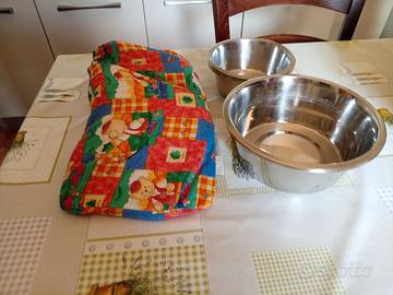 Trasportino colore beige/bordeaux cm 32x48 h30, compreso cuscino e 5 ciotole metalliche