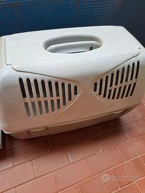 Trasportino per cane di media taglia o anche adattabile per gatto con chiusura e fessure laterali per aria. completamente in plastica lavabile. colore grigio.