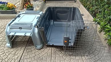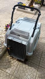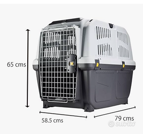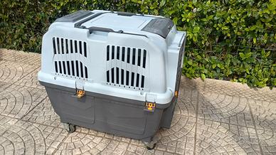 Trasportino per cani conforme normativa IATA anche per trasporto in aereo, dotato di ruote girevoli e con blocco. Maniglione per il trasporto direzionabile e con possibilità di blocco e due tasche rigide per accessori. Porta in acciaio con blocco di sicurezza. Facilmente smontabile come da immagine. Possibilità di smontaggio delle ruote. Preferibile consegna diretta all' acquirente.