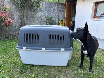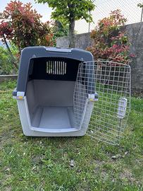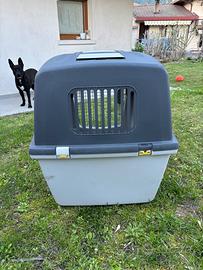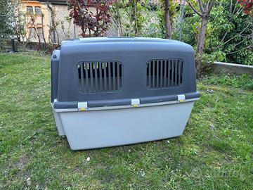 Vendo trasportino per cani di medie e grandi dimensioni. Si trova in ottimo stato ed ha una maniglia per facilitare la presa e due scomparti per ciotola acqua e altri accessori. Misure 98x77x64.