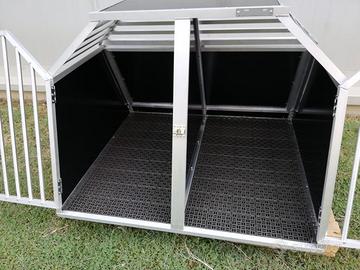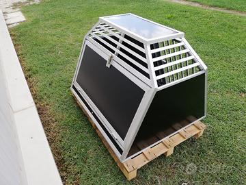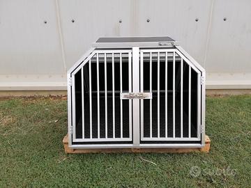 Trasportino per cani a due posti, con divisorio esterno. Uscita di sicurezza posteriore, cerniere lucchettabili in acciaio inox, pedane in PVC anti sporco. Leggero e molto pratico. Dimensioni di ingombro 104 (larghezza) x 90 (profondità) x 75 (Altezza). Condizioni Pari al nuovo, vera occasione.