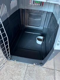 Trasportino per cani di media e grande taglia conforme alle norme per il trasporto aereo. Porta cromata con chiusura e sistema di sicurezza, ganci laterali, manico girevole con impugnatura ergonomica, vani superiori con sportelli. Completo di ruote e griglie metalliche alle finestrelle (accessori aggiuntivi). Usato per 1 solo viaggio