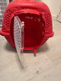 Causa inutilizzo vendo trasportino in plastica (no metallo perche il mio gatto mordeva le barre). Il box è costruito in polipropilene atossico con fori per una perfetta areazione e una porta in plastica con comodi ganci di chiusura sui quattro angoli per avere la possibilità di aprirla o rimuoverla. Il robusto trasportino è dotato di una maniglia a scomparsa per un trasporto sicuro.Colore rosso e celeste. Dimensioni 48.5 cm x 34 cm x 32 cm