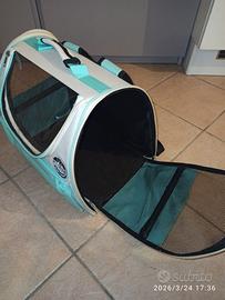 Trasportino in tessuto rigido adatto a trasportare gatti o cani di piccola taglia. Aperture laterali con metà parte in retina cosí che si possa vedere all'interno. Tasca centrale con sopra finestrella trasparente apribile con cerniera. Maniglia centrale e spallacci resistenti in modo che si possa trasportare l'animale anche in spalla.