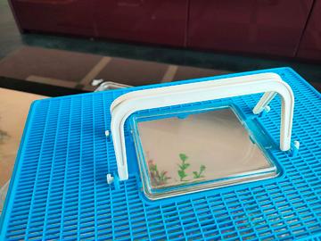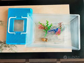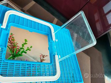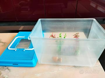Trasportino per pesci con coperchio a incastro, manici e finestrella per il cibo. Marca Ferplast. Lavato sempre senza detersivi chimici.