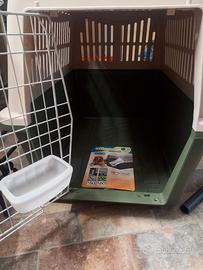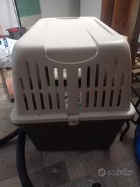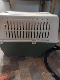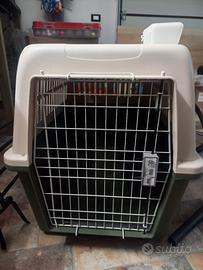 trasportino per cane taglia media e grande apertura sul davanti conforme alle norme IATA per trasporto treni, aerei e navi porta metallica con chiusura sicurezza alette ventilazione su ogni lato mai usato facile da pulire predisposto per rotelle misure lungo 0,90 largo 0,57 alto 0,68 euro 90,00.