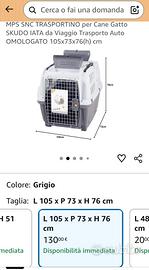 Trasportino per cani di taglia grande, misure: lunghezza 105 cm, larghezza 73 cm, altezza 76 cm Pari al nuovo, usato solo per 5/6 mesi per abituare il mio cane al trasportino, in quanto ho in programma un viaggio lungo. Lo vendo perché troppo grande per la taglia del mio cane. Omologato IATA per il trasporto aereo. Tutte le clip di chiusura in ottimo stato, come tutto il trasportino del resto, griglia di chiusura in perfette condizioni