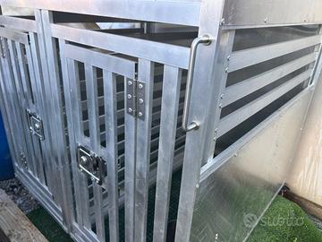Vendo trasporto cani con vasca recupero liquidi , intramezza estraibile , tappetini , ciotola per acqua , serrature a chiave , rotelle alla base , vano superiore porta oggetti ,( ne dispongo di 2 uguali ) usate 3 mesi Misure larghezza :100cm profondità 90 cm altezza 90 cm
