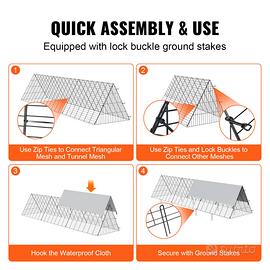 Facile da configurare o installazione fai-da-te: progettato per una comoda installazione e mobilità, dotato di serrature, picchetti di terra e fascette per un montaggio rapido. I tunnel pieghevoli per polli da cortile risparmiano spazio e facilitano la facile regolazione dell'area di attività dei polli, migliorando la flessibilità dell'allevamento.