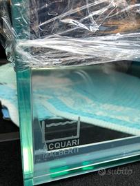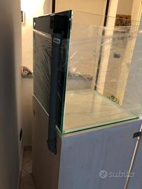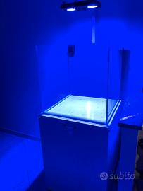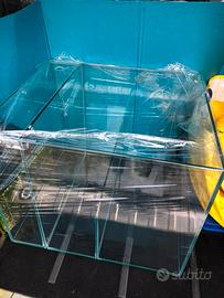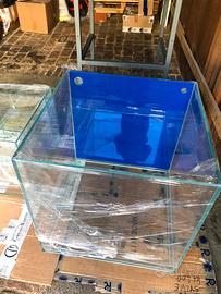 Vasca artigianale malberti cubica Misure 60x60x60 capienza 200 litri Tutta la vasca e in extrachiaro Spessore mm 10 Il vetro posteriore e mm 10 piu uno da mm 6 blu Fori di carico e scarico Angoli giu del fondo rinforzati Incollaggio trasparente Sump misura cm 50x40 alta 40 Vano skimmer, vano risalita, piu scomparto rabbocco osmotico Completo di carico e scarico e mobile Cont. Per info foto misure