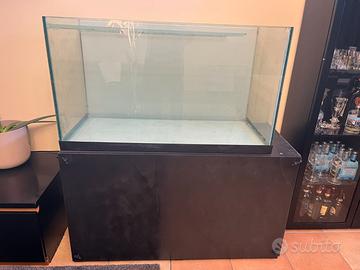 Vendo con mobile al seguito, autocostruito con resistenti tubolari in ferro verniciato per sostenere il peso, non indifferente, di un acquario di queste dimensioni. Il mobile è poi rivestito in legno verniciato nero come si vede nelle foto. Disponibile per la consegna con furgone personale, da concordare in base alla distanza.