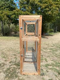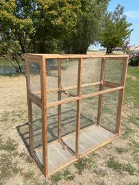 La voliera è realizzata in legno e rete metallica e presenta le seguenti misure: 156 cm (altezza) × 160 cm (larghezza) × 55 cm (profondità).