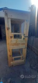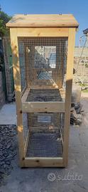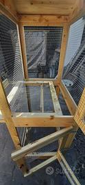 Voliera da esterno di dimensioni 2.30 x 0.8 x 0.6 mt, realizzata da un artigiano su mio progetto personale, avevo intenzione di allevare specie di volatili che non potevano vivere promiscui, di conseguenza la voliera è stata realizzata per risultare divisibile a metà da un vassoio raccogli liquami e relativa rete separatoria, così facendo diventa una voliera doppia, ovviamente all’occorrenza il vassoio centrale può essere rimosso realizzando un volume unico di 2.3 x 0.8 x 0.6 mt.