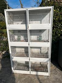 In buono stato , presenti lievi graffi. Suddivisa in 4 scomparti a loro volta separabili da divisorio come in foto per un totale di 8 gabbie. Misure : L 103 cm x P 43 cm x A 164 cm Disponibili anche mangiatoie, abbeveratoi e posatoi. Ritiro a carico dell'acquirente, per info 3405161789 Davide.